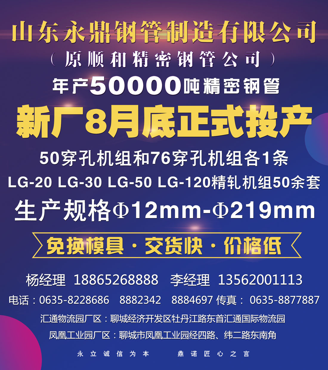 當(dāng)前位置: > 行情資訊 >> 熱點資訊 >山東昌衡信德年產(chǎn)50000噸精密無縫鋼管8月底正式投產(chǎn)